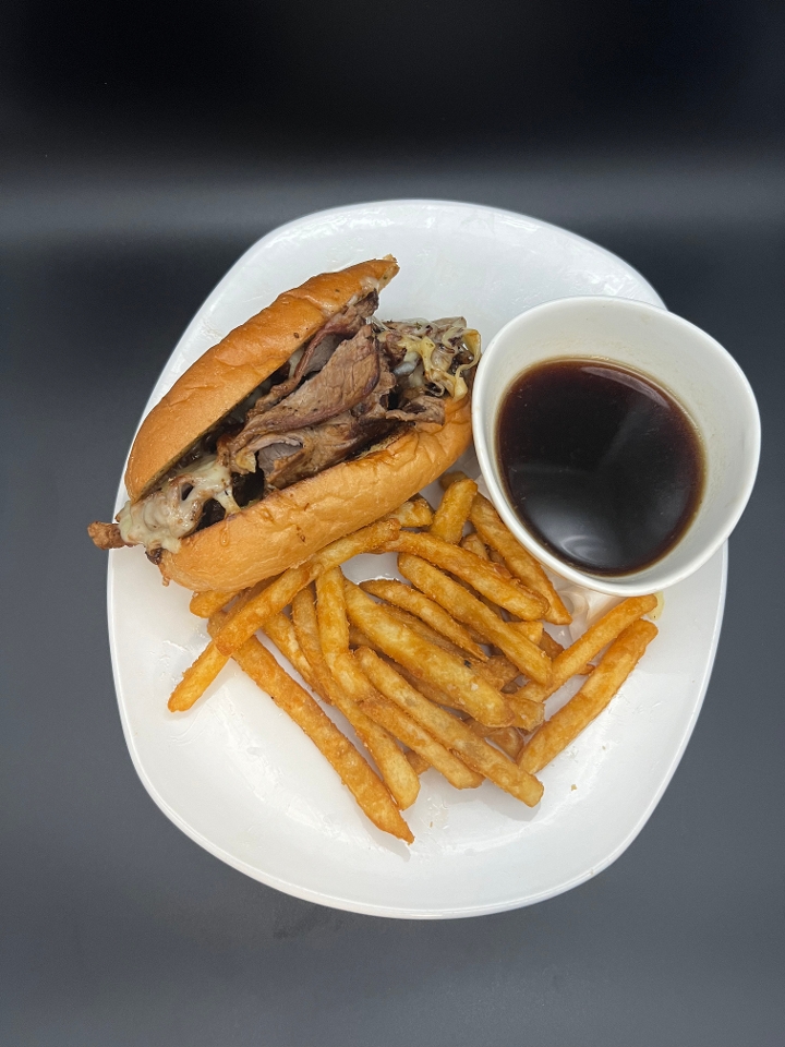 House Roasted shaved Ribeye, white cheddar, manhattan onions, everything horseradish aioli, sourdough hoagie, Au Jus