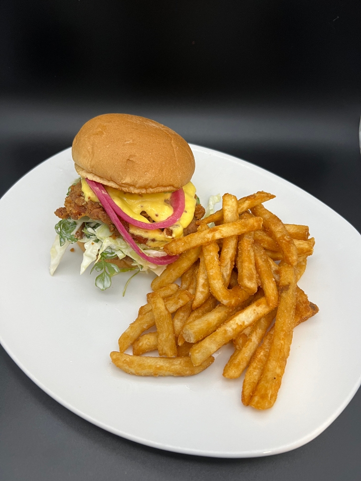 Hand Breaded Chicken Breast, Maple Bourbon BBQ, Cornflake Crumble, Alabama Sauce