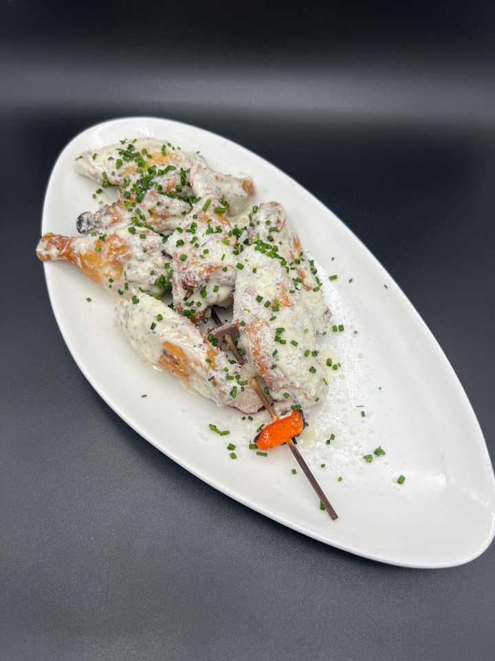 Bone-in wings, veggie kabob, ranch swiss fondue
