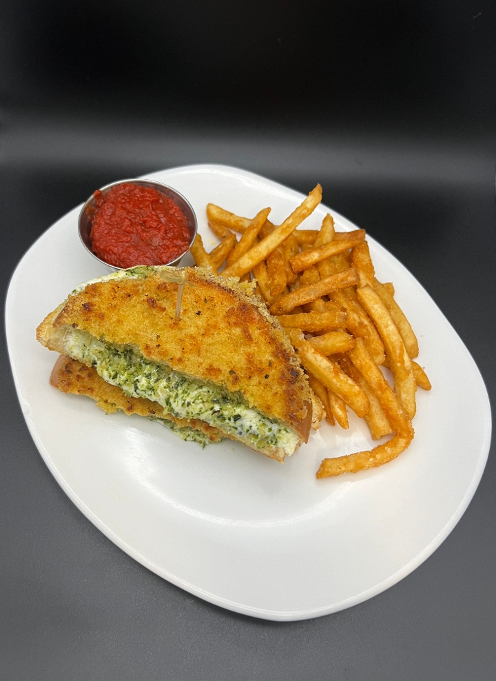 Fresh Mozzarella, Pesto, Panko Grilled Sourdough Bread, Marinara Dipper